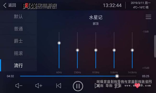 播放界面可以對EQ進行調節(普通,爵士,搖滾,流行),播放狀態,播放進度,播放模式(如隨機播放,循環播放)調節音量大小,切換上一首下一首,播放暫停,對該歌曲添加收藏等操作。