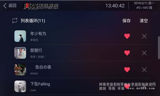 電源通電自動開機后進入的默認界面,該界面分歌曲/歌單/榜單/電臺,這幾個類目的歌曲都是通過平時使用的時候點擊收藏添加進來的。