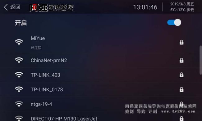 點擊WIFI設置區域進入選擇界面,開啟按鈕可以選擇打開或關閉wifi。