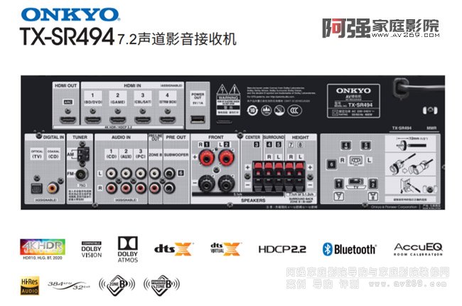 安橋功放TX-SR494從簡單易用的藍牙®無線串流到令人血脈噴張的杜比全景聲(Dolby Atmos)和 DTS:X® 音軌,TX-SR494 出色的聲音品質和智能功能為您的娛樂 生活增添了一份樂趣。七個大電流接線柱可讓您自由選擇適合的多種揚聲器與不同布局。如果您不希望安裝頂置或環繞揚聲器,杜比全景聲高度 虛擬器 * 或 DTS Virtual:X ® 以及 Dolby Surround ® 或 DTS Neural:X® 技術可以通過虛擬的方式把聲音放置于您的頭頂及腦后。TX-SR494還具備 前置揚聲器 bi-amp、Zone B 音頻等功能。配備低音揚聲器 EQ 和 AccuReflex™的 AccuEQ 音頻校準技術最高支持 5.2.2 聲道的杜比全景聲 (Dolby Atmos)揚聲器布局,讓聲音在多種不同的空間內都能獲得清晰透徹的聲音品質。作為您家庭娛樂的核心,TX-SR494 具備支持 HDR 和 4K/60p 視頻的HDMI ® 接口,圖形化菜單設計,Zone B 前級 / 線路輸出,以及人聲增強功能,都讓它成為一款好用又好聽的影音接收機。 * 需固件更新支持。