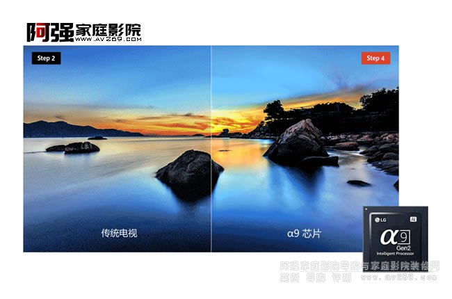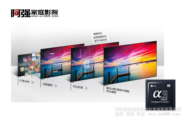 LG專為OLED電視自主研發的人工智能畫質引擎 α9 Gen2芯片,四重降噪技術,第一、第二階段消除畫面噪點和波紋,第三、第四階段抹去色帶和瑕疵,畫面表現更加清晰自然
