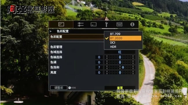 JVC N8在色彩配置方面為我們準備了4個不同的色彩配置,包括BT.709、BT.2020、DCI、HDR,我在進行4K HDR畫面調校時,發現選擇BT.2020色彩配置更能調校出接近于DCI-P3色域的色彩。