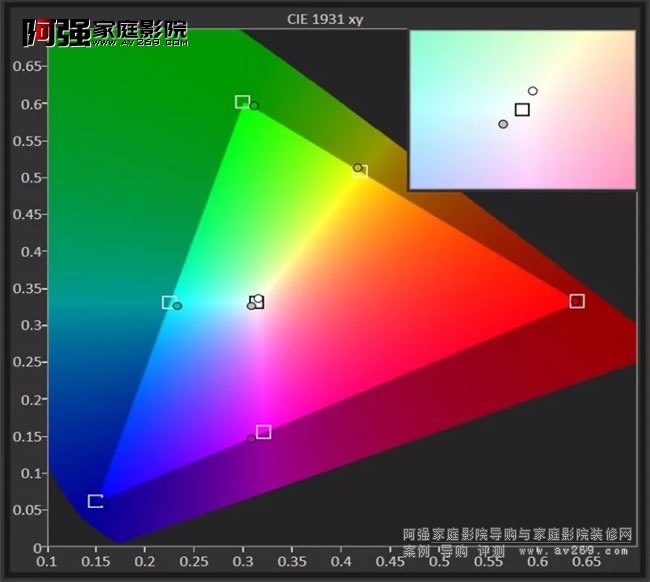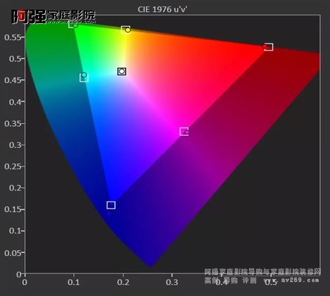 測試部分,我們分別針對HD與4K HDR兩個不同狀態進行了灰階與色彩的分析。首先是HD方面的表現,在影院預設模式下測量的色域范圍已經接近于BT.709標準,在綠色、青色、藍色與洋紅色部分有輕微的偏差。