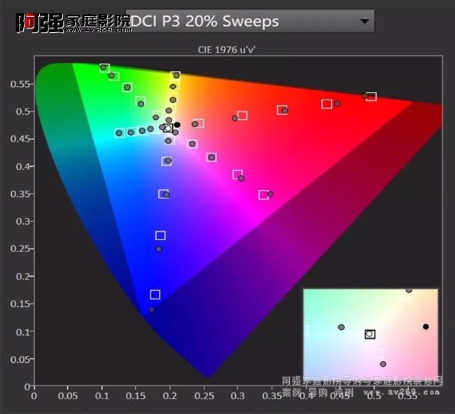 在4K HDR狀態下,我們以DCI-P3色域為測量與調校標準,可以清楚地看到N8的色域覆蓋范圍已經非常接近DCI-P3標準,更難能可貴的是,N8在不同飽和度下的色彩線性表現也令人滿意,此時畫面亮度較HD狀態要高,達到23fL。