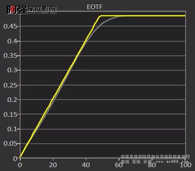 最后,我們再來看看4K HDR狀態下的EOTF灰階表現,整體曲線接近于ST.2084標準,高光部分從50%灰階開始滾落,到40%灰階部分貼近曲線,經調校后高光細節有一定程度損失。