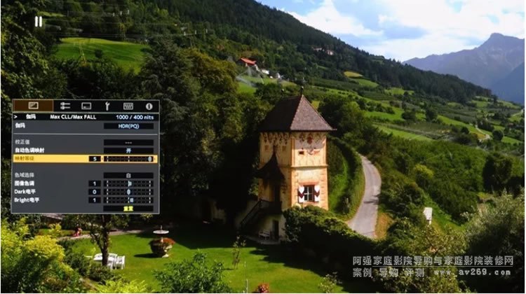 進入到伽瑪菜單,N8將會自動識別HDR高動態范圍影像的最高亮度與平均亮度,用戶可以很清晰地了解到你所觀看的4K HDR片源的制作數據。我們在調校過程中一方面,我們可以關閉“自動色調映射”的功能,對EOTF曲線進行整體、暗部與高光的微調,另一方面,也可以開啟“自動色調映射”功能,從-5到+5共11段的色調映射自動調整功能,來讓你自己來把握亮度與細節之間的平衡,選擇一個合適的EOTF曲線。而從“自動色調映射”功能開啟后的實際效果來看,整體畫面風格還是偏向于盡量保留畫面的細節,亮度方面有所控制,如果你投射的是一個150英寸的超大屏幕,我更建議大家選擇手動調整的方式,以獲得更高的畫面高光能量。