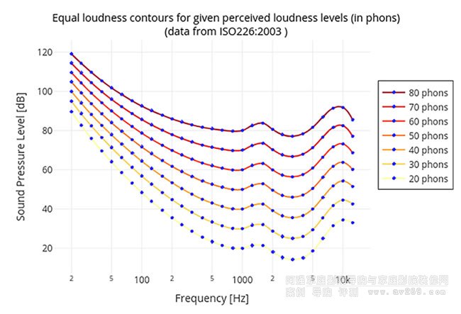 藍色曲線是H.Fletcher和W.A.Munson得出的等響曲線,紅色曲線是被國際標準化組織(ISO226)所采用的等響曲線,由Robinson和Dadson所完成,兩者還是有不小的區別