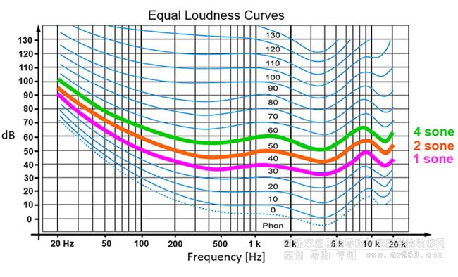 因為從字面上看,響度級太像響度的單位,有些人很容易將它與響度真正的單位“宋(sone)”搞混。1宋被定義為1kHz頻率、響度級為40方(或聲壓級為40dB)的響度大小。根據大量實驗統計得出的數據,一般來說,聲壓級每增加10dB,大部分人會感覺到響度增加一倍,減少10dB,響度會減少一半。為什么要在1宋的定義里引入響度級的概念呢?因為透過等響曲線,我們可以得知1宋響度下,不同頻率的聲壓級各是多少,然后根據聲壓級和響度的關系,將其轉換為宋,再進行疊加,這樣一來就能大概估計噪聲的響度。聲壓級是機器測出來的音量,響度是人耳感覺到的音量。比起聲壓級的對比,響度對比會更加直觀清晰。