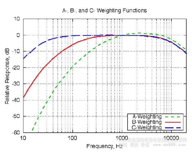 下面我們來說說用于讀取聲壓級的設備——聲級計。從等響曲線可以看出,人耳對低頻和高頻部分的靈敏度都不高,而且這種情況在較低的聲壓級下會更加明顯。為了模仿人類的聽覺系統,聲級計通常會提供A、B、C三種計權,它們能讓聲級計的讀數更加貼近聲音的相對響度。其中A計權的頻響曲線是40方等響曲線的反轉,B計權是70方等響曲線的反轉,C計權是100方等響曲線的反轉。選擇哪種計權要根據測量對象的聲壓級大小來確定。聲壓級在20-55dB之間,選擇A計權;在55-85dB之間,選擇B計權;在85-140dB之間,選擇C計權。通常來說,A計權更加常用,用它測量時,最終的測量值會標明dBA。由于A計權在1kHz以上是基本平直的,因此dBA與未計權讀數的差別,主要體現在低頻部分。假如這兩種讀數有著較大差別,表示信號有著明顯的低頻成分。