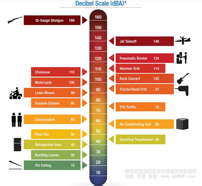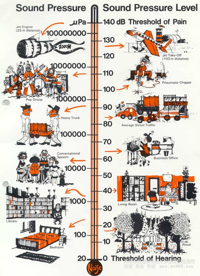 這個概念還是比較好理解的,但聲壓級(Sound pressurelevel,通常縮寫為SPL)就不一樣了。按維基百科的定義,“聲壓級是指以對數尺衡量有效聲壓相對于一個基準值的大小,用分貝(dB)來描述其與基準值的關系。”簡直就是傳說中“每個字都認識,但放在一起就看不懂”的生動范例。想要弄懂聲壓級,需要先弄懂分貝。你可能會覺得,分貝有什么難懂的,它不就是聲壓級的單位嗎?當然不是。“分貝(decibel)”是一個很廣的概念,是量度兩個相同單位之數量比例的單位。為了避免涉及太多概念和公式而使文章顯得過于復雜,下面我們直接看聲壓級和分貝的計算公式:SPL=20log10(p/pref)dB,其中p=聲壓,pref=參考聲壓。