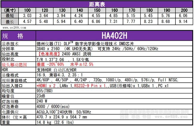 明基4K投影機HA402H可完整顯示830萬有效像素,是獲得美國isf認證、THX雙重認證的投影產品,支持HDR、3D技術。此外,明基4K投影機還繼承了明基機色準投影機的精準色彩表現。14片新鍍膜低色散鏡片,6倍速RGBRGB純色系色輪,結合明基投影機專業的色彩調校經驗,使得畫面符合REC.709國際高清色彩標準。