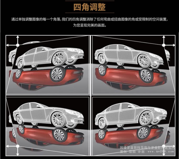 支持垂直水平梯形校正和四角校正功能,調(diào)整因投影機(jī)傾斜而導(dǎo)致的圖像失真
