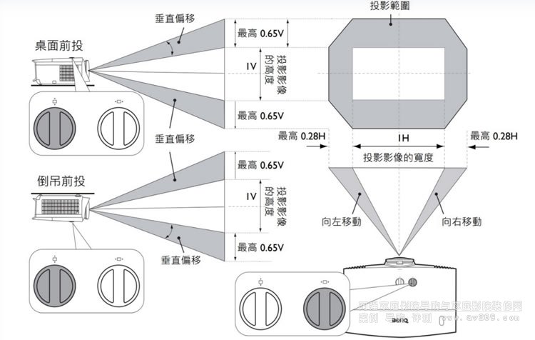 這種大幅度鏡頭位移調節配合 1.6 倍的縮放比,在安裝上有更好的靈活性,使得它應付多種影音空間。透射比為 1.36 – 2.18,最大可以投射 200 寸,而投射 100 寸所需的距離為 3 米,在擁有影音室的用戶家中,這個完全不是問題,即便是普通用戶的客廳,通過鏡頭位移調節也可以獲得不錯的感官。
