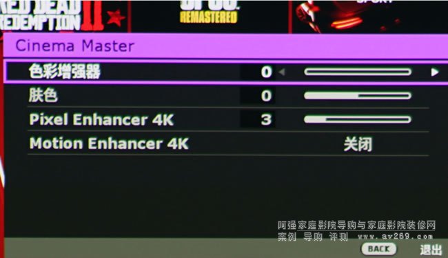 此前提到的 CinemaMaster Video+ 技術在管理模塊上也有四個獨立的設置,分別是 Color Enhancer(色彩增強)、Flash Tone(膚色優化)、Pixel Enhancer 4K(像素增強)以及 Motion Enhancer 4K(動態增強),通過這四個獨立的調節,可以使得普通的藍光影碟或者是普通 1080p 影片得到色彩上的增益、人物膚色更接近真實、像素增強至 4K 畫質,同時最后的插幀技術使得流暢度大大提升。