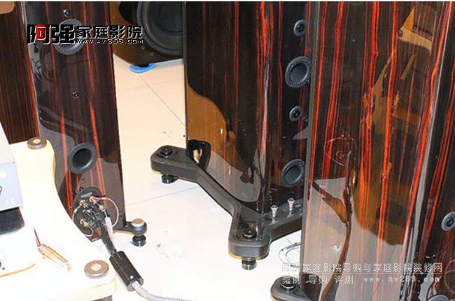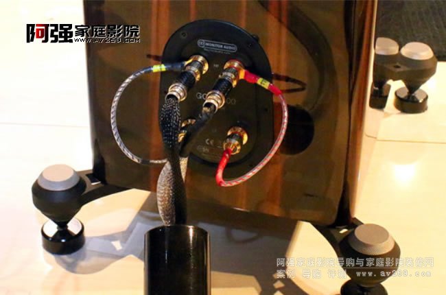 搭載8寸低音單元的Monitor Audio Gold 300音箱寬度僅有240mm,屬于瘦高型外觀的設計,為了讓它站立得更為穩固且抑制音箱之震動共鳴,Monitor Audio為其設置了向外張的鋁鑄金屬腳座,四腳頂端各設置有可由內部螺栓調整高度的抑震尖錐。為了讓整體聲音表現更上層樓,樂林張云捷老板除了在尖錐底下加上腳墊外,也將隨附的Bi-Wire音箱跳線更換為美國Nordost的高貴產品。
