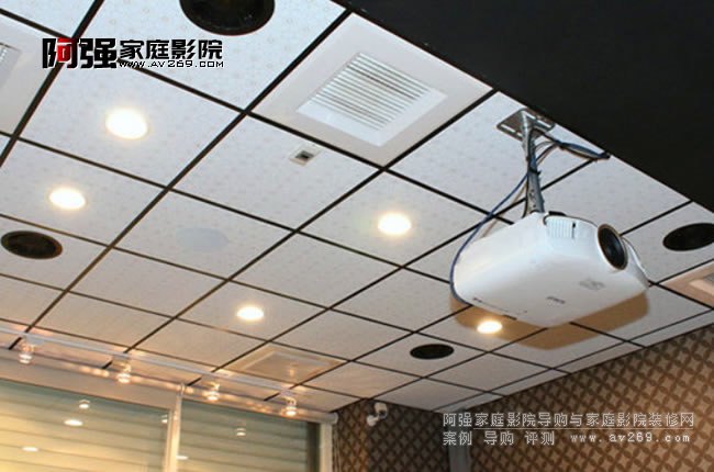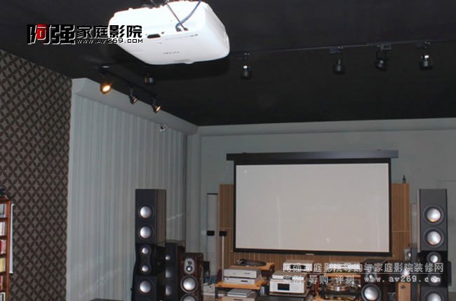 這是從樂林視聽室后上方往前拍攝的照片,各位可以看到視聽室前面三分之二范圍內的天花板都漆成黑色,如此可以有效減少來自天花板的環境反射光線,而前方及兩側墻面漆成灰色,在視聽室不開燈的狀況下,來自墻面的反射光也比一般白墻來得微弱。