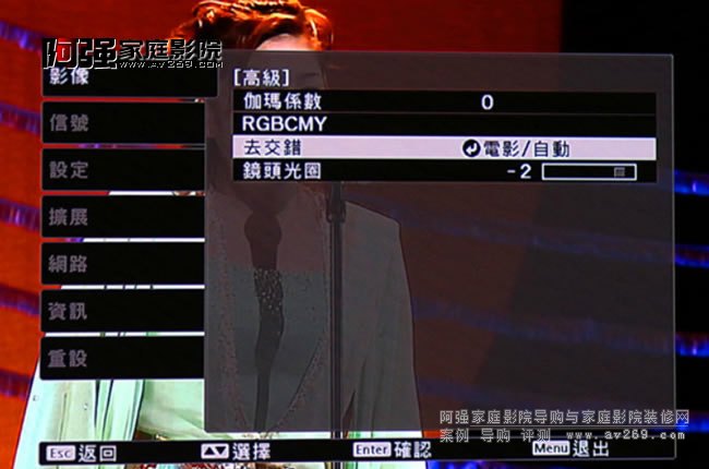 本站先前評測的Epson EH-TW8400是該廠的最終工程樣機,樂林這里安裝的則是正式量產機型,進入選單察看發現在影像調整的“高級”頁面里多了“去交錯”與“鏡頭光圈”兩個新選項,顯現Epson持續為旗下產品呈現更好畫質不斷努力的精神。