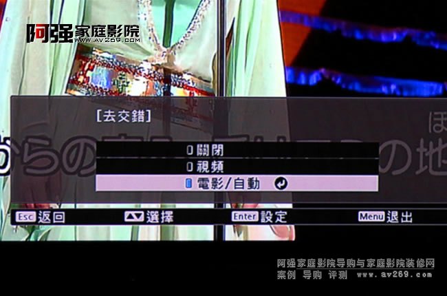 “去交錯”選項內有“關閉”、“視頻”與“電影/自動”等三個項目,應該是可針對60p視頻與24p電影內容做去交錯優化處理的設定,對于一般用家而言,原廠預設的“電影/自動”應該是最理想的設定。