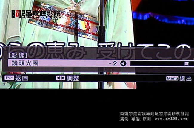 “鏡頭光圈”選項可以設定往下衰減的數值,理論上就如同拍照或攝影時縮小鏡頭光圈般,可以讓影像的銳利度與實體感再提升,不過類似樂林這邊使用非高增益銀幕、投影距離又相對較遠的狀況來說,可能就不適合縮小“鏡頭光圈”的數值了。