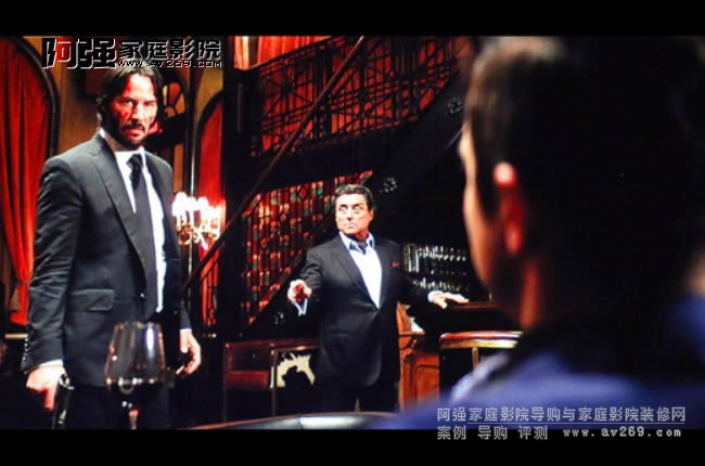 Santino(上圖右)為躲避John Wick的追殺而躲到殺手組織“大陸酒店”內,但John Wick不遵守大陸酒店內不能見血的禁令,仍然舉槍對著Santino的頭部擊發槍殺他。這個舉槍擊發的動作如同迅雷不及掩耳般快速,樂林視聽室Monitor Audio Gold系列此一槍擊音效爆發力與動態的表現實在非常驚人!影像部分,請看看上方這張銀幕畫面實拍,左側John Wick的黑色西服立體感與質感,以及后方紅色布幔等深紅色的背景,是不是都有著豐富的色調描繪與扎實的形體感?