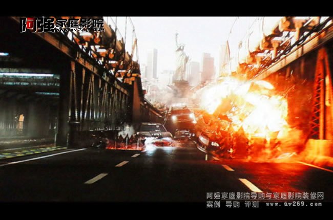 眾人在晨曦中起跑出發,有很多激烈的碰撞與高低起伏,Monitor Audio Gold音箱系統對各種音效的描寫與定位、移動、包圍感表現都很到位,當“大金剛”出現阻止選手們前進時,在上方高樓樓頂跳躍與揮拳猛擊的片段,配備8寸低音單元、擁有45Hz低頻延伸能力的C380-IDC“天空音箱”,果然發揮了比一般產品渾厚扎實許多的能量,也讓人更清楚感受大金剛“泰山壓頂”的沉重壓力。影像部分,賽車碰撞爆炸的火光在黎明時分街道上顯得特別耀眼,明暗之間的對比與亮部及暗部的階調都相當好,看看上面這張銀幕屏攝畫面就可感受得到,而且實際上現場親眼所見的HDR影像效果還更好。