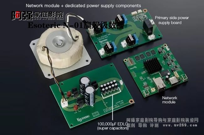 下方照片是左右聲道完整的DAC模組,每邊聲道都有一個(gè)獨(dú)立環(huán)形變壓器,并各搭配8個(gè)大型調(diào)節(jié)電容。左右獨(dú)立電路板各用上4個(gè)AK4497晶片與2個(gè)MOSES03 OP放大晶片,還用上了獨(dú)家EDLC(Electric Double-layer Capacitor),各有125,000μF的雙層超級(jí)電容。另外為了維持類比輸出電路的精確度和大動(dòng)態(tài)頻寬,N-01也使用了獨(dú)家的HCLD(High Current Line Driver)高電流驅(qū)動(dòng)技術(shù),采用高電流輸出與高速轉(zhuǎn)換率的高性能元件作為線路驅(qū)動(dòng)器,具有出色的速度和準(zhǔn)確度。