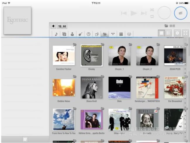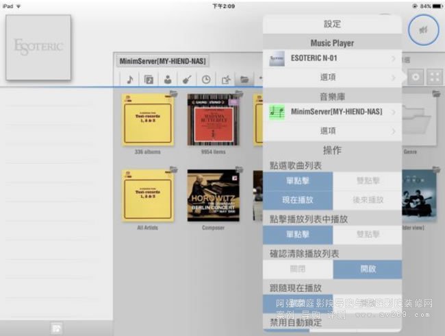 我使用iPad控制時(shí)的畫面如下,相當(dāng)清晰整齊,字體大小和字型都相當(dāng)順眼。第一次開啟如果沒看到任何資訊是正常的,點(diǎn)選設(shè)定(齒輪的圖示)后在Music Player處選擇連線器材,當(dāng)然就是Esoteric N-01,在音樂庫的地方選擇的是在家中同樣網(wǎng)路下連線上的裝置,通常是Nas,選擇好后就能播音樂了,操作下方的選項(xiàng)就是一些使用習(xí)慣的變更。