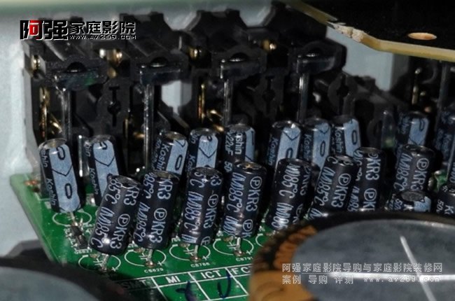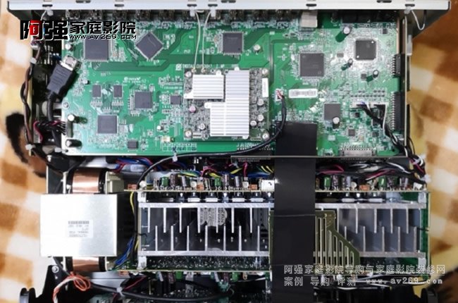 (1)前面左側是電源部分,中間到右側是帶散熱器的9聲道分離式元件功放板(底部還設計有兩個根據溫度自動啟停的散熱風扇,保證高功率運行快速散熱),后面是音視頻解碼板:
