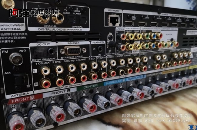 2.各種接口全。SR6014的音視頻端口十分豐富。音頻方面,除了帶有傳統的CD等模擬音頻、同軸及光纖數字音頻等輸入端口,還帶有全景聲11.2聲道前級輸出接口、7.1聲道前級輸入接口。視頻方面,除了DVD色差分量視頻輸入、輸出端口,還配備支持最新2.3規格4K 60Hz分辨率的HDMI輸入端口8個(前1后7)、輸出端口3個。具有完整的11組功率輸出喇叭接線端子(可任意設置選用9組),結合內部9聲道功放,再增加一個2聲道立體聲功放,既可實現7.1.4全景聲功能。