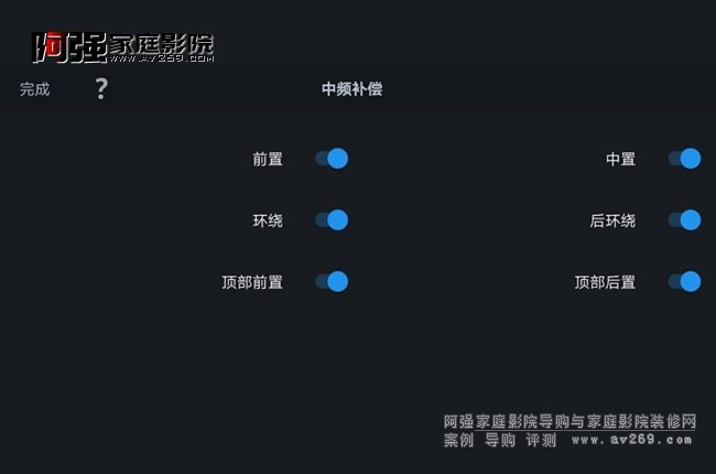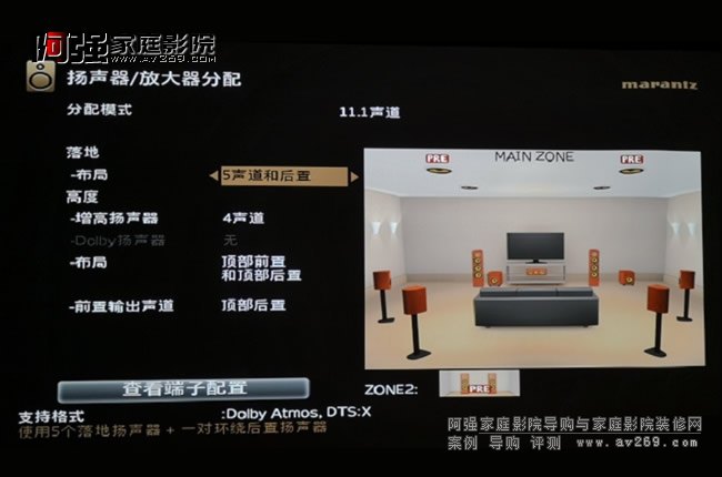 (2)系統設置。進入音頻菜單里的揚聲器/放大器分配選項,分別設置系統模式(7.1、11.1等)、地面音箱(5.1、7.1等)、天空音箱(前置、后置、增高等)、音箱大小及交叉頻率等。