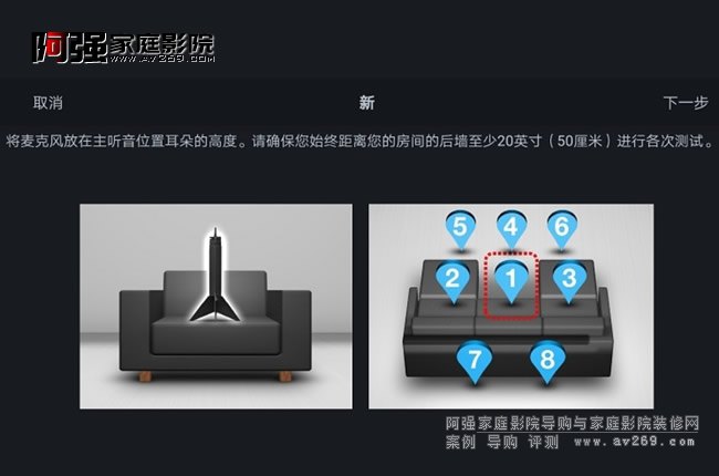 (3)自動校準。Audyssey自動校準可以通過功放菜單用遙控器操作,也可使用手機APP操作。SR6014使用的MultEQ XT32版本,最多可校準8個位置,每個測試點都有圖形編號和提示,很直觀。