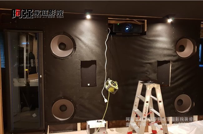 私人影院現(xiàn)場施工前墻做透聲結(jié)構(gòu)設(shè)計,前置左中右三只音箱歸位,三只音箱均有增高,而中間的為雙中置布置,重要的看點是四只18英寸大低音炮分布其中,后墻同樣分布了四只,在這樣的空間里面用了8只超低音,可以相信甲方定是一位勁暴狂熱之人。