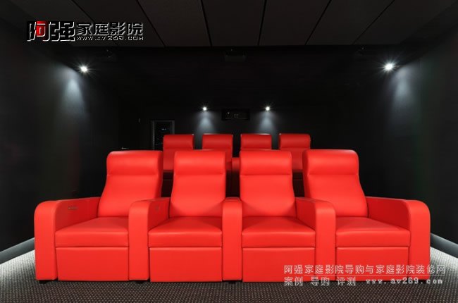 全深色空間通過光影燈帶和實物紅色的商務(wù)艙沙發(fā)提亮整個視聽空間。