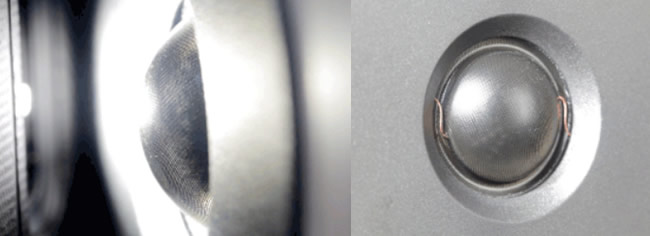 如果您從Cerotar高音單體表面看過去,很難看到內藏的Hexis,但如果用手機打光,半透明的絲質軟半球振膜后面,有半球形的突起,表面佈滿孔洞,有點像高爾夫球表面,那就是Hexis結構,這是用來打散高音單體背波的全新設計,加上高音單體內部的吸音材料,一起把高音背波去除,而且,硬塑膠材料的Hexis,還提供了絲質軟半球多一層支撐保護,不怕手指頭按到高音單體,讓絲質軟半球表面凹陷。