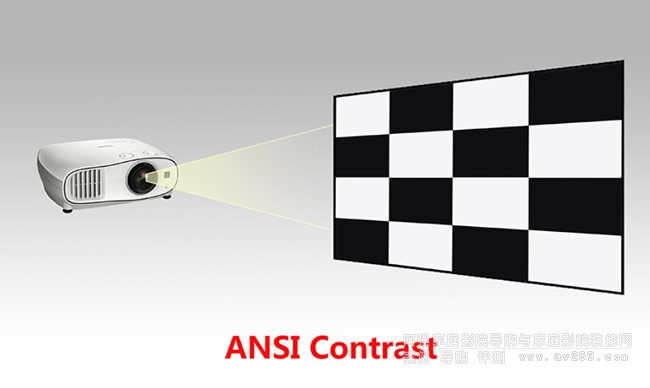 ANSI對比度,也有廠家稱之為原生對比度。ANSI使用了16個矩形進行測試,其中包括了8個白色和8個黑色的棋盤式圖案,具體過程是分別測量并平均所有白色方塊的亮度值以及黑色方塊的亮度值,然后再通過白色讀數與黑色讀數的比值得出ANSI對比度。