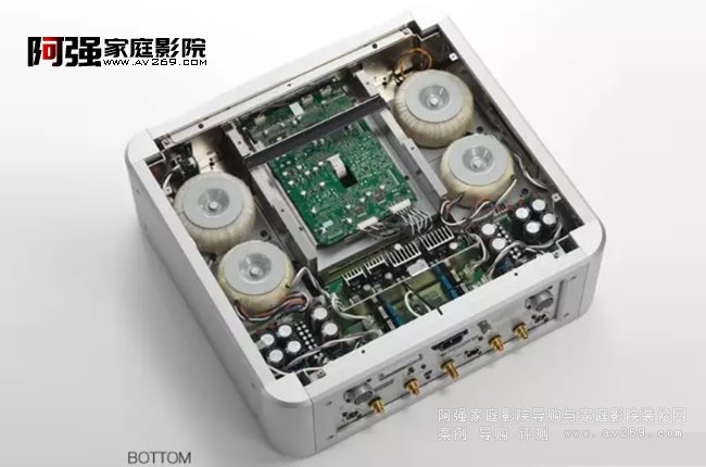 VRDS-ATLAS轉盤機構安裝在中央,以5mm厚度的鋼制底板固定,并以獨家的腳錐(專利第4075477號、第3778108號)采用四點支撐,因此能有效抑制轉動機構的振動。箱體內部采用雙層結構,主要的聲音電路配置在上層,電源電路和變壓器類則置于下層,不但能防止磁漏和振動的影響,還能讓電源供給的配線達到最短。
