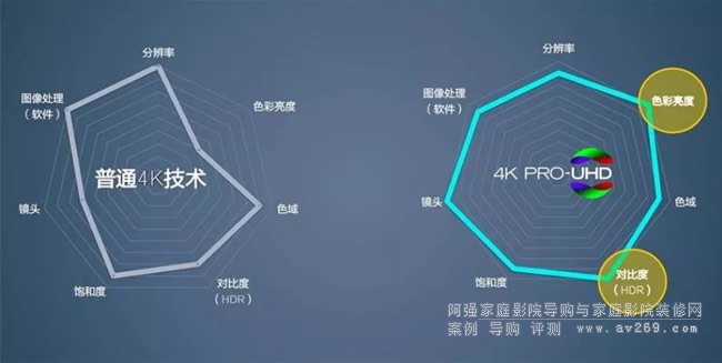 相比普通 4K 技術,愛普生 4K PRO-UHD 技術,基于 3LCD 顯示核心更加全面,尤其在色彩亮度與 HDR 高動態范圍方面