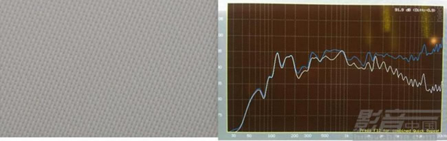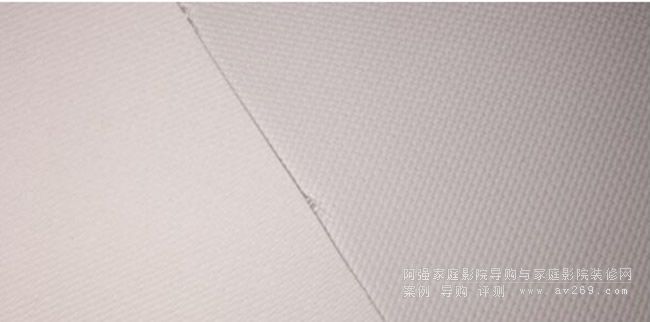 相對而言,有經驗的幕布廠家會在不堵塞透聲縫隙的前提下在編織透聲幕的基礎上制作光學涂層,其主要作用是糾正編織基材的色偏,控制色溫,提高增益。如右圖,右側是編織基材的本色,實測增益0.9,左側就是進行過涂層處理的材料,白色純度有了明顯提高,增益也提高到了1.1。