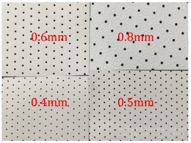 還有某款在國內有較高人氣的被代理商宣傳號稱0.4mm微孔的進口透聲幕,查詢了一下官網,官網上并沒有見到0.4mm規格的產品,只公布了兩款透聲幕:商業影院用的1.2mm微孔幕,穿孔率為4.5%,還有一款家庭影院用的0.5mm微孔幕,穿孔率為1.7%。