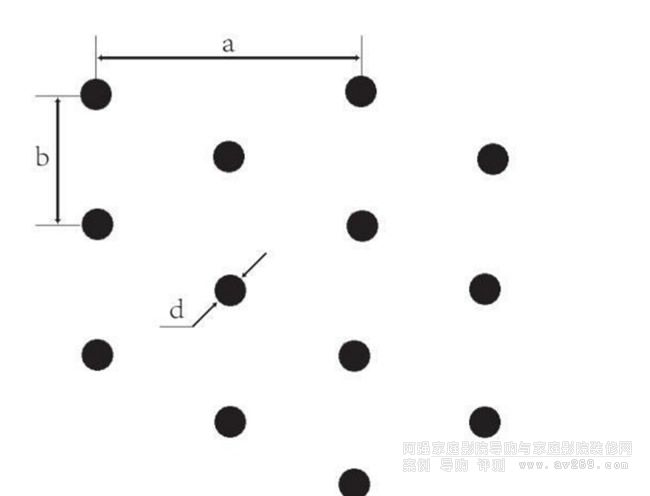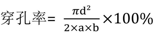 如圖,如果這款0.4mm的微孔透聲幕孔間距a=3.3mm,b=1.5mm,d=0.4mm,代入公式,可以計算出這款微孔幕的開孔率為5.1%。