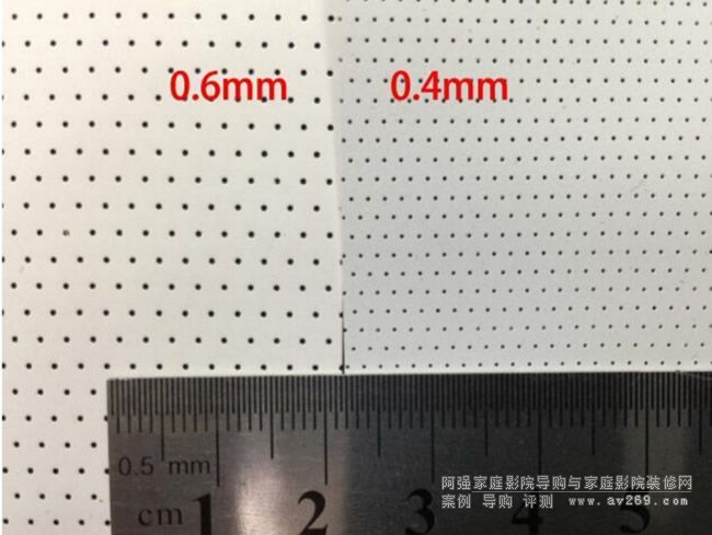 前不久結束的廣州音響唱片展上,我看到又有公司宣傳推出了0.4mm微孔透聲幕,仔細一看,原來都是0.6mm的微孔透聲幕,號稱0.4mm的,這種0.6mm的透聲幕,第一排座椅至少要離開屏幕大約6米才看不見孔,大家注意不要被虛假宣傳忽悠了。在這里拍了幾張對比照片給大家看看,如果實在分辨不出孔的大小,就帶把鋼尺去對比吧,0.4mm的孔徑,會比鋼尺最小0.5mm的刻度明顯小,0.6mm的孔徑則會比最小刻度明顯大。