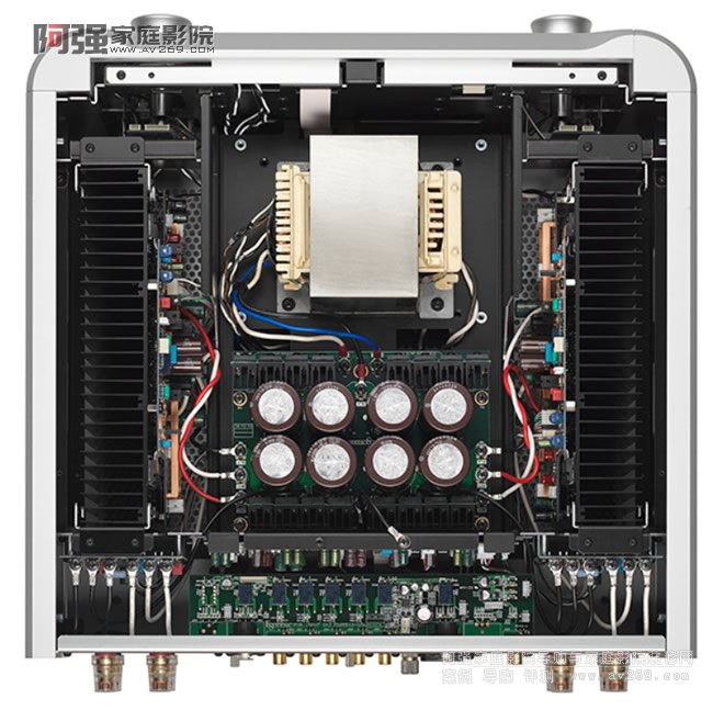 F-07具備100瓦/8歐姆輸出功率,其電源來自一顆訂製的633VA EI型電源變壓器,以及總容值達40,000uf的電容器,確保供電無虞。功率輸出部分,功率晶體採行雙平行推挽與三階達靈頓設計,可連續輸出15A電流,峰值電流更可達30A,不怕喇叭需索無度。此外,F-07并內建MM/MC唱頭放大器,而且同樣採行左右獨立分開供電,您說,F-07真的入門機種嗎?