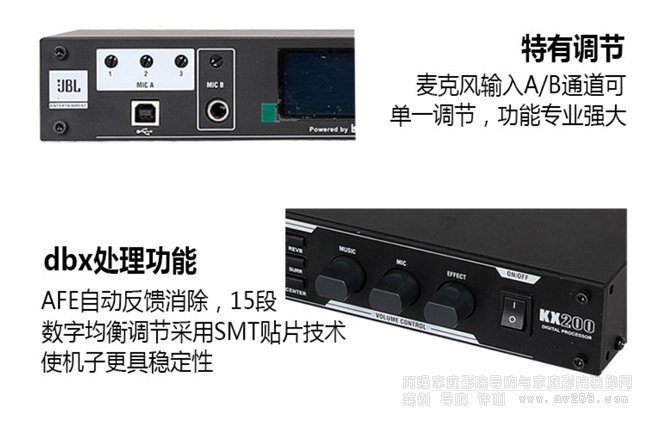 JBL KX200 卡拉OK前級效果處理器不僅提供多種音頻連接,而且融合了眾多知名音樂專業人士和歌唱家所推崇的dbx 處理器與Lexicon 效果器技術。大尺寸的LCD屏,讓參數信息顯示更全面直觀,面板操作便捷。中英文界面的電腦操作軟件,提供更直觀的操作體驗,手指輕點,所見即所得。
