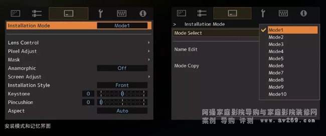 用戶可集中管理與安裝相關的設置,以便享受最適合每個環境的影像效果。可以調整鏡頭控制、像素調整、遮罩、寬畫面變形調整、屏幕調整、安裝風格、梯形校正、顯示比例等9個設置。另外,可以將10種不同的設置模式存儲在根據需要命名的存檔中。方便調用存檔中的各種環境的安裝模式。