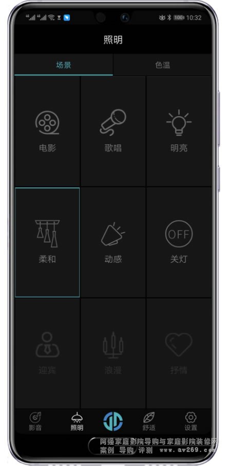 燈光控制界面我覺得沒什么好講的,就是有9個模式,先預設好,給用戶就是一鍵切換,當然也是可以和觀影/KTV的場景模式聯動,看你喜歡了。有人問這么多燈光模式有用嗎?呵呵,當你只有兩個模式的時候肯定不夠用吧,多幾個可以千變萬化啊,況且現在調光、調色那么流行。