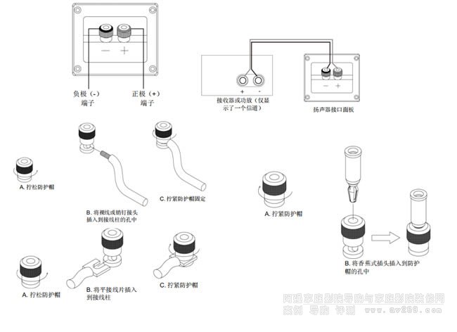 重要說明:連接時,請勿錯接極性(誤將 "+” 連接至"–"或誤將 "–” 連接至 "+")。否則,會導致立體聲聲場成像質量下降和低音減弱。