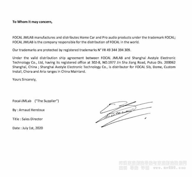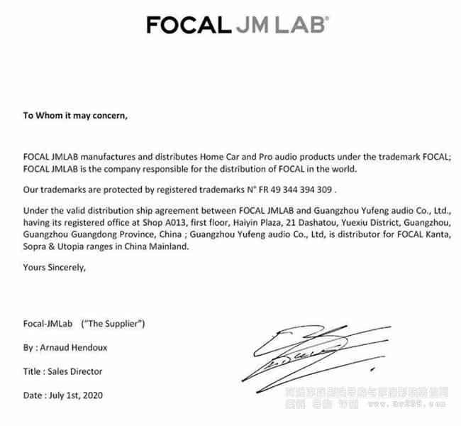 2020年7月1日法國Focal正式委任廣州域豐音響有限公司為Focal Kanta、Sopra 、Utopia 三大高端系列產品的中國區總代理,負責相關Focal產品的推廣、銷售以及相關售后服務。