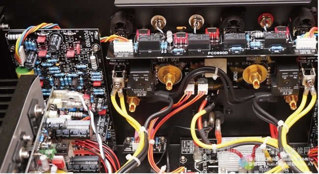 ▲這是H30的機背內側,端子連線到輸入電路板作切換,圖左前方的電路板是「Dual Amp」之中的電壓放大電路、離輸入端非常近,圖左還可以看到電流放大電路的一部分(有裝散熱器)。