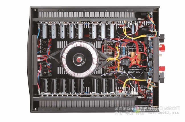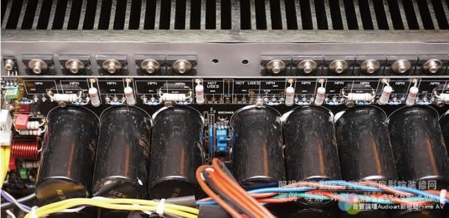 ▲此為其中一個聲道電流放大電路的一部分,它不只以大量的功率晶體作并聯推挽輸出,而且就在輸出級的功率晶體旁邊裝了一大堆大容量濾波電容。