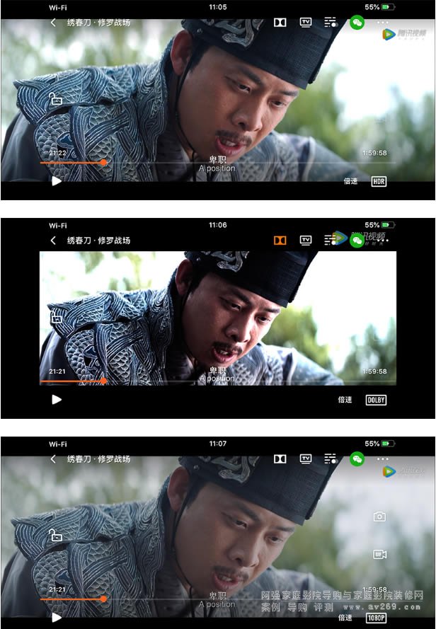 從上往下分別是騰訊視頻手機端APP的HDR致彩視界模式、杜比視聽模式和普通